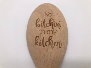 Add a playful twist to your kitchen routine with our whimsical wooden spoon featuring the charming "No bitchin in my kitchen" design. This delightful spoon is the perfect companion to your embossed rolling pin collection, offering a blend of charm and practicality that bakers and cooks will adore.
